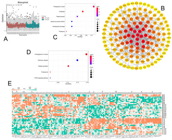 Bioinformatic analysis of differentially expressed proteins. (A) Boxplot of the differential proteins, with p−values indicating the significance of the difference between the two groups. (B) Differential protein PPI. The closer the protein is to the center, the more important it is in the network. (C) Total differential protein KEGG pathway enrichment. (D) Upregulated differential protein KEGG pathway enrichment. (E) Heatmap analysis of expression profile of differential proteins.