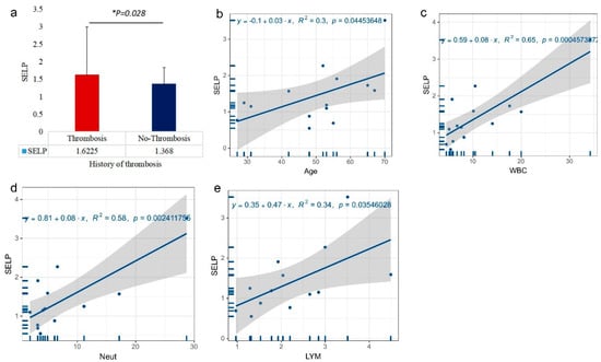 Plots of prognostic risk factors and SELP expression. (a) Difference in SELP expression between patients with and without a history of thrombosis, (b) regression of age and SELP levels, (c) regression of white blood cell count and SELP levels, (d) regression of neutrophil count and SELP levels, (e) regression of lymphocyte count and SELP levels.
