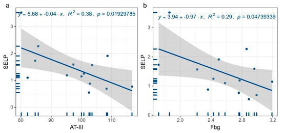 Regression plots of SELP and coagulation factor levels. (a) Regression plot of SELP and AT-III levels, (b) regression plot of SELP and Fbg levels.