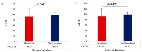 Differences in coagulation factor levels between patients with and without a history of thrombosis. (a) AT-III expression varies across patients with and without a history of thrombosis, (b) differences in Fbg expression in patients with and without thrombotic history.
