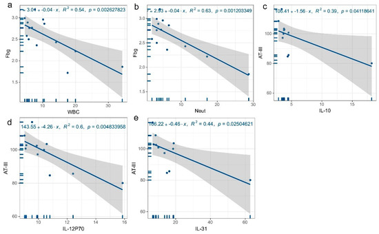 Regression plots of SELP-related indicators and coagulation factor levels. (a) Leukocyte count versus Fbg level, (b) neutrophil count concerning Fbg level, (c) IL-10 concerning AT-III level, (d) IL-12P70 concerning AT-III level, (e) IL-31 concerning AT-III level.