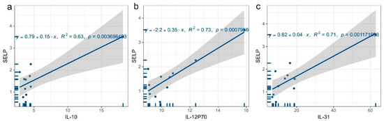 Regression plots of SELP and inflammatory factor levels. (a) Regression plots of SELP and IL-10 levels, (b) regression plots of SELP and IL-12P70 levels, (c) regression plots of SELP and IL-31 levels.