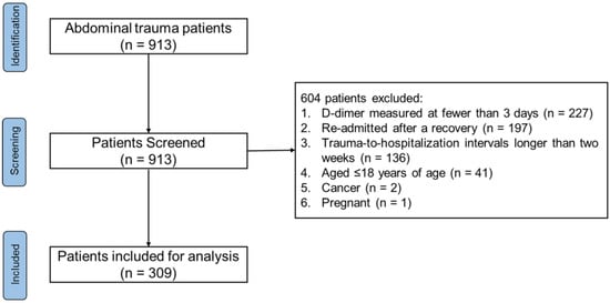 The demographics (i.e., age, gender, and body mass index (BMI)), severity of trauma, complications, length of hospital stay, longitudinal D-dimer measurements, clinical treatments, health outcomes of either discharge/death, and the corresponding dates were extracted from the electronic medical records. The severity of the trauma was evaluated by the Sequential Organ Failure Assessment (SOFA) score, Abbreviated Injury Scale (AIS), Injury Severity Score (ISS), and the probability of survival (Ps) obtained by the Trauma and Injury Severity Score (TRISS) when admitted. The TRISS Ps was computed based on a logarithmic regression equation: survival probability = 1/(1 +), where b = −0.4499 + 0.8085 × RTS − 0.0835 × ISS − 1.7430 × AgeIndex for a blunt trauma or b = −2.5355 + 0.9934 × RTS − 0.0651 × ISS − 1.1360 × AgeIndex for a penetrating trauma. The value of the AgeIndex was 0 with an age < 55 and was 1 with an age 55 []. There were missing data for the AISs (8.74%) and ISSs (8.74%). The AIS scores were imputed by the k-nearest neighbors (KNN) data imputation technique, and the ISS was calculated from the AIS (see Missing data and Table S1, Supplementary File S1). A complication of sepsis was diagnosed based on Sepsis-3 []. Intra-abdominal infection was confirmed according to the abdominal symptoms, increased inflammatory biochemical markers, and computerized X-ray tomography []. VTE was diagnosed by duplex ultrasonography or computed tomography []. Renal dysfunction was defined as the two-fold increase in serum creatinine and blood urea nitrogen or anuria for >6 h []. Liver dysfunction was defined as serum bilirubin ≥ 2.0 mg/dL [].