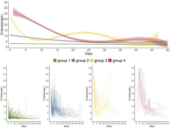Compared with the static assessment of D-dimer, our study underscores the value of monitoring and evaluating the trajectory patterns of D-dimer in trauma patients. Previous studies evaluating D-dimer observed variations in the cut-off values. For example, Lee et al. found that patients with a D-dimer higher than 34.53 mg/L measured in the first 24 h after trauma had a 1.033-fold (95% CI: 1.016–1.051) higher risk of 28 day mortality, while Ishii et al. showed that D-dimer measured at admission as being higher than 110 mg/L was significantly associated with the 28-day mortality (OR = 5.89, 95% CI: 2.78–12.70) [,]. One reason for these inconsistent results is that they assessed the effect of D-dimer based on the single values of D-dimer measured at different time points post-trauma. D-dimer tested at a single time point post-trauma may introduce bias due to the different time windows of disease. In a study of longitudinal D-dimer, Jiang et al. found that patients had probabilities to present both increasing and decreasing D-Dimer levels in the first 24 h post-trauma []. In this study, transient high D-dimer measurements were widespread in the early phase in groups 3 and 4; however, only patients in group 4 presented a slowly resolved D-dimer and had a statistically-higher risk of mortality in reference to group 1. The D-dimer trajectory in group 3, which was rapidly alleviated, led to favorable health outcomes. A single-time D-dimer measurement could not sufficiently present a comprehensive picture of the coagulation changes during hospitalization.