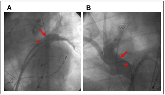 Examples of intraprocedural pulmonary vein angiography (arrows). (A) shows the left superior pulmonary vein at 40° LAO, and (B) shows the right superior pulmonary vein at 30° RAO. The MP-1 catheter was inserted via a transseptal sheath (asterisks).