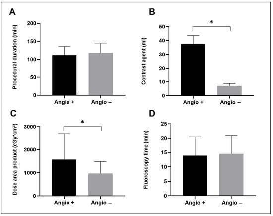 Comparison of selected procedural parameters between patients who had received PV angiography (Angio +) and those without PV angiography (Angio −) (mean with standard deviation). (A) shows the procedural duration, (B) shows the volume of contrast agent applicated during the whole procedure, (C) shows the dose area product for fluoroscopy and (D) shows the fluoroscopy time. * indicates statistical significance.