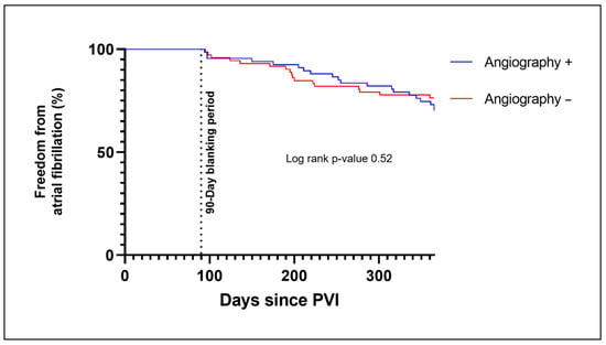 Within the follow-up period of 1 year, recurrence of AF occurred in 26.6% of patients (20 patients in the Angiography + and 17 patients in the Angiography − group) (Table 2). In the Kaplan–Meier analysis, there was no significant difference in freedom from AF in both groups in the first year after PVI (log-rank p-value 0.52) (Figure 3). Among patients who received additional left atrial lines because of sustained atrial fibrillation or atypical atrial flutter after PVI 4 (50%) in the Angiography + and 3 (42.9%) in the Angiography −group showed a recurrence of atrial arrhythmia in the follow up. This is higher than in the overall study population, although the absolute numbers for this subgroup were low in the study.
