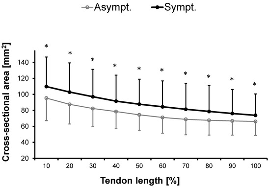 Radovanović, G.; Bohm, S.; Arampatzis, A.; Legerlotz, K. In Achilles Tendinopathy the Symptomatic Tendon Differs from the Asymptomatic Tendon While Exercise Therapy Has Little Effect on Asymmetries—An Ancillary Analysis of Data from a Controlled Clinical Trial. J. Clin. Med. 2023, 12, 1102. https://doi.org/10.3390/jcm12031102