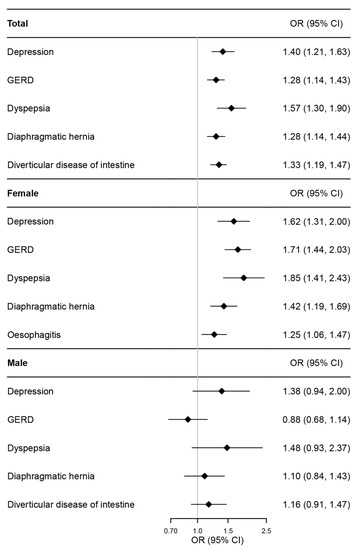 | Dyspepsia | 6153 | 141,949 | 1.07 (1.04–1.10) | 9.83 × 10−7 |