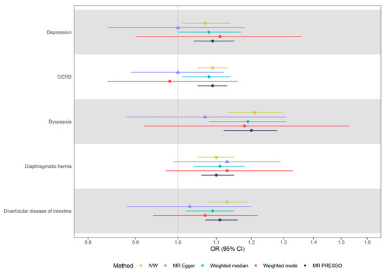 - Freuer, D.; Linseisen, J.; Meisinger, C. Asthma and the risk of gastrointestinal disorders: A Mendelian randomization study. BMC Med. 2022, 20, 82. [Google Scholar] [CrossRef] [PubMed]