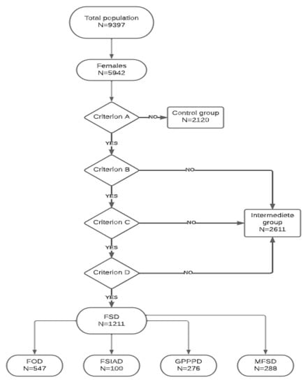 DSM-5 identifies three female sexual disorders (FOD, FSIAD, GPPPD) within FSD [14]. The participants of our study were divided into three major groups according to the DSM-5 A-B-C-D criteria. Figure 1 shows the flowchart of our classification. The control group consisted of those who answered no to DSM-5 criterion A (experience of symptoms). Respondents who answered ‘Yes’ to criterion A but ‘No’ to criteria B, C, and D formed the intermediate group; these subjects remained in the database but were not included in the present analysis. Respondents who met all four criteria formed the group of women with FSD. In their case, we analyzed separately those who had only one type of FSD (FOD, FSIAD, GPPPD) and those who had more than one female sexual disorder simultaneously (multiple FSD, MFSD). The FSD group included women affected by a disorder according to the DSM-5 criteria system (A, B, C, or D). Within this, we analyzed the different disorders one by one (FOD, FSIAD, GPPPD) and MFSD. The online questions were structured in such a way that questions eliciting an affirmative reply were followed by more detailed questions to assess the recognition; however, if we received a negative answer, the additional questions were automatically skipped. The advantage of this method was that the relevant issues were sufficiently explored, and the questionnaire was not discouragingly long.