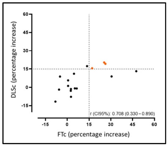 Correlation agreement rate for the improvement between the FTc and DLSc, increasing by >15% of their relative value from the CMRd to CMRf.