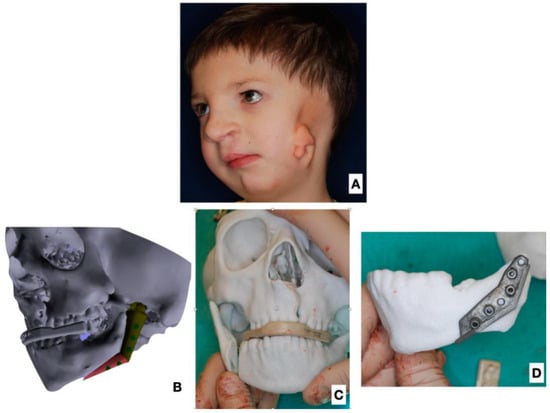 Patient 5 years old with HF Pruzansky III. (A) Three-quarter view, soft tissue deformity visible, with auricle microtia. (B) 3D image reconstruction with planned free fibular flap reconstruction. (C) Stereolithographic model for intraoperative planning and control. (D) Stereolithographic model with intraoperative template.