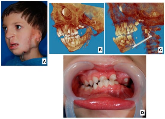 The same patient two years after surgery. (A) Three-quarter view after completion of osteodistraction. (B) 3D image reconstruction after FFF reconstruction. (C) 3D image reconstruction after completion of mandibular distraction. (D) Intraoral view with visible overcorrection and dentition set in reverse occlusion.