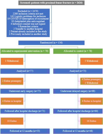 - Rafael, A.; Mireia, R.; María, G.J.; Victoria, M.; Angélica, M.; Noèlia, V.; Erica, D.C.; María, A.R.; Francesca, R.; Patricia, G.; et al. Evaluation of a strategy to shorten the time to surgery in patients on antiplatelet therapy with a proximal femur fracture (AFFEcT Study): Study protocol for a multicenter randomized controlled clinical trial. Medicine 2019, 98, e15514. [Google Scholar] [CrossRef]