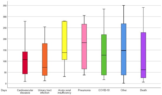 Among the 143 patients that underwent surgery, four patients in each group died in-hospital. Therefore, 135 patients were discharged alive. After hospital discharge and during the 12-months of follow-up, patients presented a median of two complications per patient (from 1 to 6) and a median of appearance of 110 days (from 1 to 350). In total, eight (5.7%) patients presented surgical wound complications, 80 (55.9%) presented medical complications, and 61 (42.7%) presented serious adverse events without differences between groups. The most common complications after discharge were death (34 patients), urinary tract infection (24 patients) and cardiovascular diseases (13 patients) (Table 2; Figure 2).