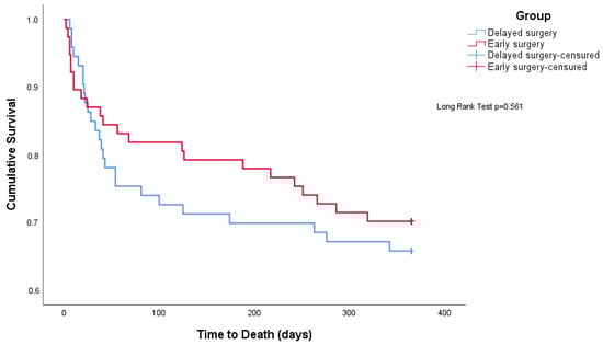 Mortality was reported as a cumulative incidence proportion. Survival was calculated from the time of hospital admission to 12 months after surgery by group. The survival differences were calculated by Kaplan-Meier method using the Log rank test.
