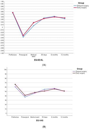 We evaluated QoL throughout the study, from baseline to the end of follow-up. For changes in the VAS and EQ-5D-5L scores, a two-way ANOVA was performed. The factors were group (intervention and control), time (baseline, at day 5, and at 1, 6, and 12 months after surgery), and the interaction between them. The ANOVA was performed using a general linear model (GLM) procedure.