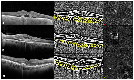 OCT and OCTa images in Type 1 MNV (A), type 2 MNV (B), and type 3 MNV (C).