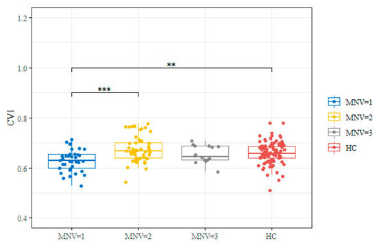 Box and whisker plot for CVI value by groups (MNV = 1, 2, 3 and HC). Box and whisker plots show 25th and 75th percentile ranges (box) with 95% confidence intervals (whiskers) and median values (transverse lines in box). Significance code: ** p-value < 0.01; *** p-value < 0.001 derived from Wilcoxon rank sum test post hoc. HC: healthy controls.