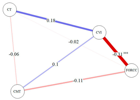 Correlation network analysis for MNV (all types). A blue line shows a positive correlation and a red line shows s negative correlation. The strength of the relation is shown by the thickness of the line. Significance code: *** p-value < 0.001.