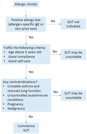 In order to clearly elucidate the characteristics of AR patients who may be offered SLIT (or cases when SLIT is contraindicated), we propose an algorithm, as shown in Figure 1.