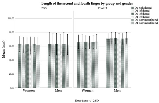 We also explored sex differences in 2D:4D ratios, as according to previous studies, it is expected to find differences between males and females. Our results show an interaction between sex and the length of the index finger on both hands and the length of the ring finger on both hands for the control group, with women having smaller fingers than men, in accordance with previous studies [20,21,22]. However, this finding does not apply to the PWS group, as no interaction between sex and the length of 2D or 4D fingers on any hand was found. These results might suggest that MaTtEr could affect PWS subjects more than control subjects. Similarly, we did not find an interaction between sex and 2D:4D ratios in the control group, as previous studies suggest [20,21,22], nor an interaction between sex and 2D:4D ratios in the PWS group.