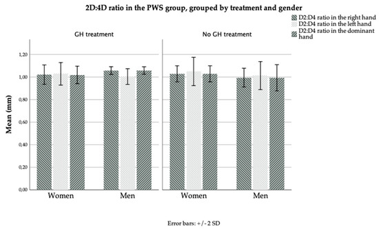 PWS-GH participants showed some significant differences compared to healthy controls (Table 5). PWS-GH participants have no significant differences compared to controls in 2D or 4D length; however, they showed a significantly higher ratio compared to our healthy control sample in the 2D:4D ratio, in both the right hand and the dominant hand (Table 5).