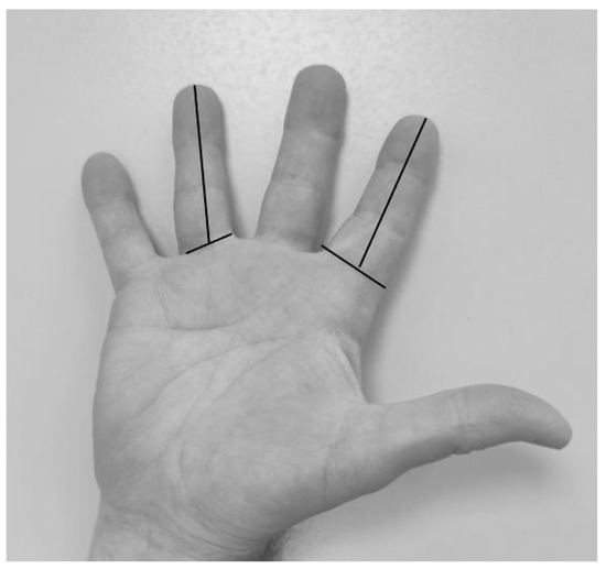 There are different strategies to measure 2D:4D digit ratios [47]. In our study, the digit ratio measurement of each hand was obtained by the same researcher (JC) using the same procedure: A Caliper Vernier was used for the ventral measurement in the second finger (2D). The measurement was taken from the middle of the crease of the first phalanx to the middle of the ball of the finger (see Figure 1 and Figure 2). This procedure was repeated for the fourth finger (4D). Finally, the length of the second digit was divided by the length of the fourth digit to obtain a measure of the 2D:4D ratio for each hand separately [47,48]. We also included the measure of the dominant hand, which was identified by asking the volunteers. In case of any doubt, the dominant hand was identified as the writing hand or main hand for delicate manual activities.