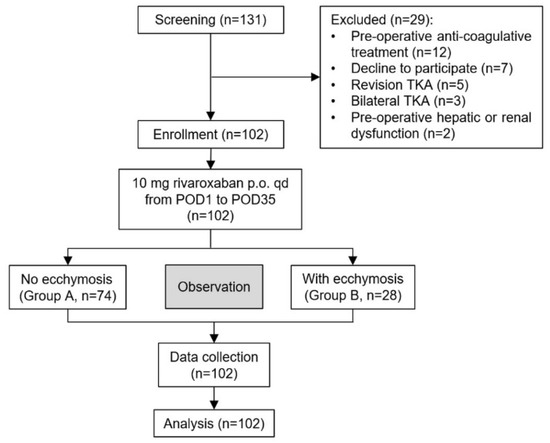 A total of 131 TKA patients were screened during the study period (Figure 1). However, 29 of them were excluded: 12 received preoperative anti-coagulation, 7 declined to participate, 5 received revision TKA, 3 received bilateral TKA and 2 were combined with severe hepatic or renal dysfunction preoperatively. Finally, 102 patients were recruited in this study. The 74 patients (72.5%) without ecchymosis and the other 28 patients (27.5%) developed various degrees of ecchymosis after TKA and were divided into a non-ecchymosis group (group A) and an ecchymosis group (group B), respectively. Most ecchymosis appeared on POD3 and were mainly located around the surgical site. The mean area of ecchymosis was 2.59 ± 2.27% of body surface. No significant difference was observed about the baseline characteristics (such as age, body mass index (BMI), hepatic and renal function) between the two groups (Table 1).