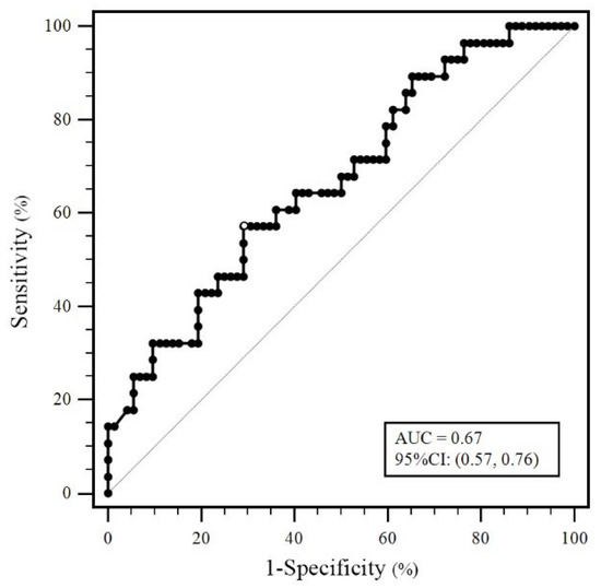 The aFXa levels of group B were significantly higher than those of group A, both on POD1 (p = 0.01) and POD3 (p < 0.01) (Table 2). ROC curves were constructed to show the relationship between a true positive and a false positive when using postoperative aFXa to predict ecchymosis. The cut-off value of aFXa on POD3 was determined to be 121.38 ng/mL at maximal Youden index, associated with an area under the ROC curve of 0.67 (95% CI 0.57–0.76) (Figure 2). No statistical difference was found between the two groups regarding perioperative values of PT, APTT and the variables of TEG. (Table 2 and Table 3). The sensitivity, specificity, positive predictive value (PPV), negative predictive value (NPV), positive likelihood ratio (LR+) and negative likelihood ratio (LR−) at postoperative aFXa cut-off value of 121.38 ng/mL are shown in Table 4.