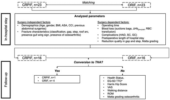 Protocol of the investigation. After matching closed reduction and percutaneous internal fixation (CRPIF) patients to open reduction and internal fixation (ORIF) patients, the presented in-hospital data were obtained. Afterward, patients were asked to participate in the follow-up examination. Patients who received total hip arthroplasty (THA) after one postoperative year were noted. If patients received no THA, the functional outcome and quality of life were assessed using the presented instruments. * Two patients refused to fill out the EQ-5D TTO. Body mass index, BMI; American Society of Anesthesiologists grading, ASA; Charlson Comorbidity Index, CCI; difference between pre- and postoperative hemoglobin concentration, ∆Hbpre-post; red blood cell, RBC; hospital-acquired death, HAD; surgical complications, SC; general complications, GC; visual analog scale, VAS; range of motion, ROM.