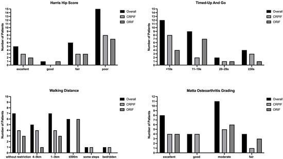 The data of patients who already had a THA at the time of follow-up were excluded because they did not reflect the functional surgical outcome of their respective group (CRPIF n = 1; ORIF n = 3). Patients with initial follow-up had the following fracture types: ACPHT (n = 19; CRPIF n = 9; ORIF n = 10), anterior column (n = 2; CRPIF n = 0; ORIF n = 2), two columns (n = 1; CRPIF n = 1; ORIF n = 0), T-type (n = 1; CRPIF n = 1; ORIF n = 0), and transverse (n = 4; CRPIF n = 3; ORIF n = 1). The demographics of the patients with follow-up and outcome results are shown in Table 2 and Figure 2. Neither group differed in terms of the time to follow-up. The groups displayed no significant differences in health conditions and functional outcomes. Distributions according to the respective grading systems are presented in Figure 2, without significant differences (p > 0.05). No difference was observed in the use of analgesics between the two groups, either in terms of intake per se or the WHO level.