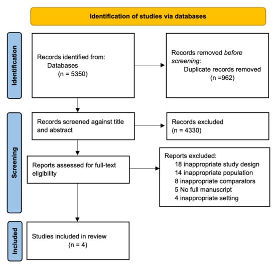 A total of 5350 studies were identified from the initial database search. After removing duplicates, the 4388 studies underwent a title and abstract review. We then evaluated eligibility, following the inclusion criteria, and only 58 studies were selected for full-text review. Finally, we identified four studies for data extraction based on exclusion criteria. The PRISMA flow diagram for the review is shown in Figure 2.