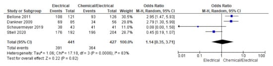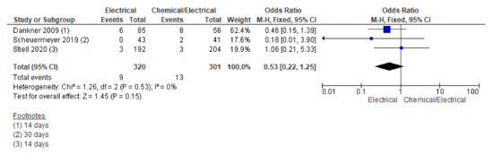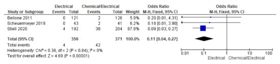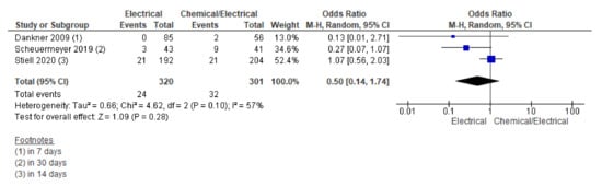 Three RCTs reported overall adverse studies during their study period. A pooling of the data for the adverse events rate using the random effect model did not show statistically significant differences across the two groups; however, a pooled forest plot showed lower odds trending towards the electrical arm (OR 0.25, 95% CI 0.03 to 1.72; n = 727; I2 = 87%) (Supplementary File Figure S5).