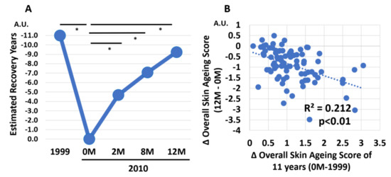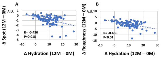 3.3. Change of Skin Hydration Was Negatively Correlated with Change of Skin Aging Parameters