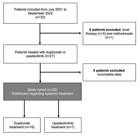 In this prospective, open-label, non-interventional, monocentric study, children and adolescents aged 6 to 17 years suffering from moderate-to-severe atopic dermatitis were included. Data collection was performed from July 2021 to September 2022 at the Department of Dermatology, Venereology and Allergology, University Hospital Frankfurt, Germany. The treatment strategy was chosen in clinical routine independently of study participation. The patients and their parents were informed about the possibility of participating in this prospective study only after the treatment decision was made. A total of 33 patients were enrolled. Twenty patients received therapy with dupilumab, seven patients were treated with upadacitinib, five patients were treated with only a topical therapy and one patient was treated with methotrexate. In the present work, the data of those patients who received either dupilumab or upadacitinib are analyzed (n = 27). Four patients were excluded due to an incomplete data set (Figure 1).