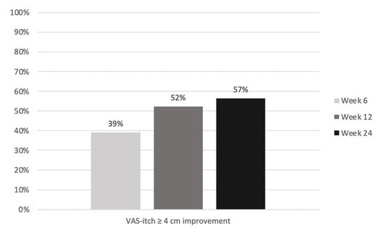 The therapy also significantly reduced the patients’ itching: the median VAS-itch score decreased from 9.0 at baseline to 5.0 at week 6 and 4.0 at weeks 12 and 24 (p < 0.001; Table 3). An itch reduction of at least 4 cm on the visual analog scale was achieved by 39.1%, 52.2% and 56.5% of patients at weeks 6, 12 and 24, respectively (Figure 3).