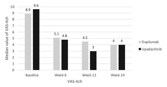 Median VAS-itch score; p-value in Mann–Whitney U test for dupilumab (n = 16) vs. upadacitinib (n = 7) subgroup comparison (all time p > 0.05).