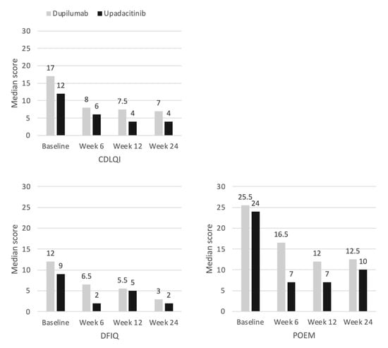 Median value of CDLQI, POEM and DFIQ; p-value in Mann–Whitney U test for dupilumab (n = 16) vs. upadacitinib (n = 7) subgroup comparison (all time p > 0.05).