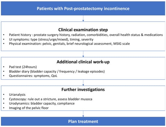 A careful clinical history is fundamental to the clinical process, and, despite the lack of formal evidence, there is universal agreement that this should be the first step in the assessment of patients with urinary incontinence (UI) [,]. The clinical history alone can categorize UI into stress SUI, urge UUI or mixed MUI, and can recognize those who might benefit from a referral to an appropriate specialist (e.g., pelvic diseases, neurological conditions). Evidence from the female population has shown that urodynamic stress incontinence can be correctly identified in primary care from the clinical history alone, with a sensitivity of 92% and specificity of 56% []. The history should include questions about the type, timing and severity of the UI, as well as questions about any other associated urinary symptoms. Additional questions about co-morbidities, medications and overall health status are recommended [].