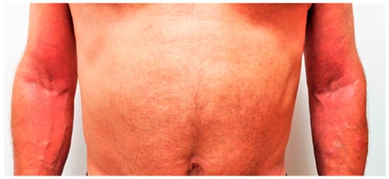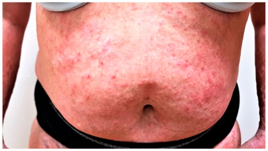 Case 2. Our second patient is a 46 year old female with a history of atopic dermatitis, bronchial asthma, polyvalent allergy, and cancer duplicity—colorectal cancer stage IIIa and carcinoma of right kidney stage Ia, both treated with surgical removal, followed by adjuvant chemotherapy and radiotherapy, 2 years before she visited our department. Atopic dermatitis was under control with only occasional application of topical corticosteroids until she was diagnosed with cancer. After the cancer treatment, she presented to our department with severe pruritus NRS 6/10 and a diffuse eczematous eruption—EASI score of 50 (Figure 1). Impact on quality of life was severe with a DLQI score of 15; she complained of inability to sleep due to continuous pruritus, her work productivity was seriously impaired, and she had to seek psychological help.