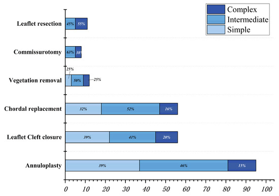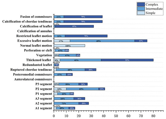 Among the patients undergoing mitral valve repair, more complicated lesions needed the use of more complicated surgical techniques during the operation. The surgical technique score was correlated with the complexity score (r = 0.6317, p < 0.0001) (Supplementary Materials Figure S1). For example, the most common etiology in the simple group was atrial mitral regurgitation. In the vast majority of cases, only implantation of an annuloplasty ring can reduce the area of the annulus and increase the area of valve coaptation, thus reducing or even eliminating mitral regurgitation. In the intermediate group, for patients with mitral valve prolapse with involved multiple segments, in addition to implanting an annuloplasty ring, reconstructing the chordae tendineae and redundant leaflet resection was needed to provide enough support in systole and increase the area of valve coaptation. Rheumatic valvular disease was the most common cause in the complex group (70.5%). Other causes included mitral valve prolapse involving multiple segments (11.40%), Barlow’s syndrome (6.8%), and infective endocarditis (11.4%), of which the proportion of patients with each disease was almost the same. These diseases in the complex group not only involved a wide range of leaflets but were also accompanied by changes in valve morphology and chordae tendineae, which greatly increased the difficulty of surgery. In addition to conventional treatments, such as implanting an annular ring and reconstructing chordae tendineae, other complex operations, such as junction incision and leaflet resection, were also needed. It is also difficult to adjust the length of artificial chordae tendineae to achieve the best attachment. Therefore, the rate of mitral valve repair in the simple group was high (89.5%, 34/38), but significantly decreased in the intermediate (35.6%, 16/45) and complex (25.7%, 9/35) groups. Additionally, the intermediate and complex groups were more likely to convert to artificial valve replacement.