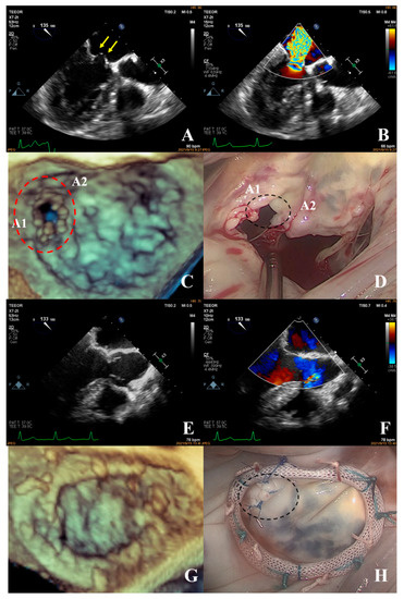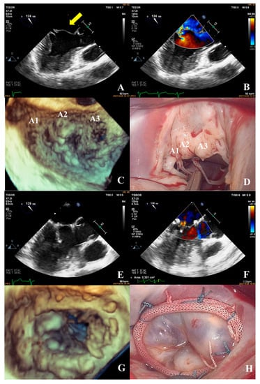 Figure 7. Prolapse of the anterior mitral valve with apparent discontinuity (A) (yellow arrow shows the cleft of the leaflet), massive regurgitation during systole, VC: 8.0 mm (B); the three-dimensional image of the mitral valve shows a cleft (C) between the A1 and A2 segments (dotted red line). During surgery, a cleft (D) was observed between the A1 and A2 segments of the anterior mitral leaflet, consistent with the preoperative diagnosis. The cleft was sutured and the mitral valvular ring (H) was placed. The surgical technique score was 1 + 1 = 2. After the spontaneously returned heartbeat, the forming effect was good and no obvious reflux signal (E,F) was found. The annuloplasty ring of the mitral valve was visible on 3D ultrasound (G), which was consistent with the intraoperative view (H). - The most common pathogenesis in the intermediate group was mitral valve prolapse involving multiple segments, with or without ruptured chordae tendineae. Mitral valve prolapses most often involved the posterior leaflet, specifically the P2 segment [17,19,22]. A patient with mitral valve prolapses involving the A1, A2, and A3 segments but no rupture of chordae tendineae had a complexity score of 7 (3 × 2 + 1) and a surgical technique score of 5 (2 × 1 + 1). The prolapsed leaflets were processed to reconstruct the artificial chordae tendineae and suture the sector junction to provide enough support when the leaflets were closed, thus increasing the coaptation area to reduce regurgitation (Figure 8).
