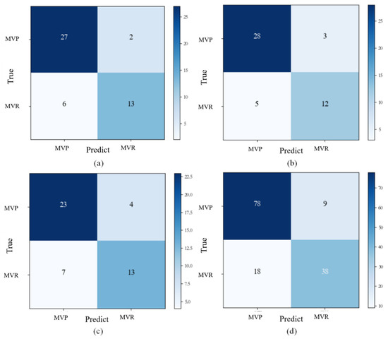 Confusion matrix for predicted outcomes. (a) Group 0; (b) Group 1; (c) Group 2; (d) total data. Abbreviations: MVR: mitral valve replacement, MVP: mitral valve repair.