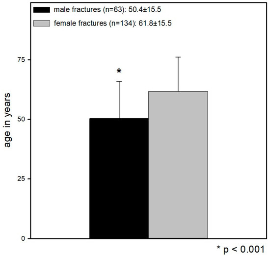 The patient group comprised 197 patients with distal radius fracture and no other injuries or previous injuries to the affected extremity, of which 134 were female and 63 male patients with a mean age of 62 years (61.8 ± 15.5) (M ± SD) in the female and 50 years (50.4 ± 15.5) (M ± SD) in the male patients. Male patients were significantly younger than female patients (p < 0.001) (Figure 1).