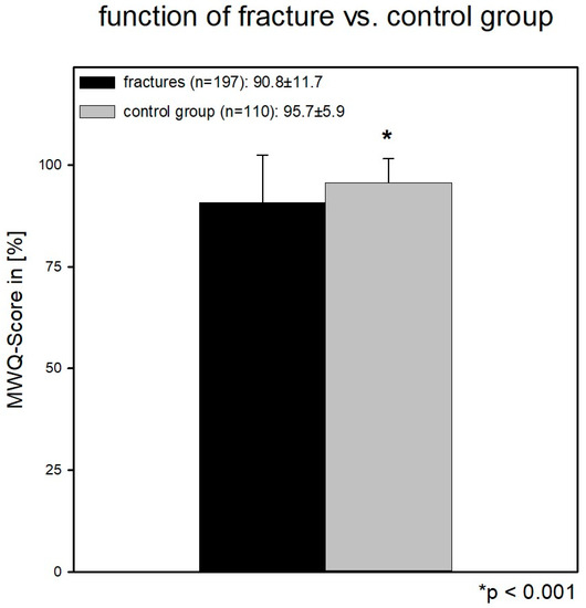 Function of the patients vs. the control group: the control group showed significantly better wrist function than the patient group (95.7 ± 5.9 control and 90.8 ± 11.7 fracture) (p < 0.001).