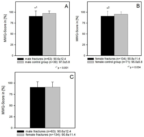 (A) Male patients had a significantly worse outcome compared to the control group MWQ (97 ± 5.8 and 90.6 ± 12.4) (p < 0.001). (B) The same result was found in the comparison between the female patients and the female control group (90.8 ± 11.4 and 95 ± 5.8) (p = 0.034). (C) There was no difference in function between female and male patients (90.8 ± 11.4 and 90.6 ± 12.4) (p = 0.85).