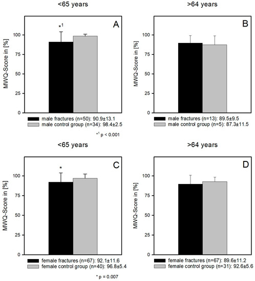 The situation was similar in the male patients. The comparison of the <65-year-old male patients with the corresponding control group showed a significantly worse postoperative function of the fracture group (90.9 ± 13.1 and 98.4 ± 2.5) (p < 0.001). As well as in the group of >64-year-old female patients, there was also no significant functional difference when comparing the older male patients with their control group (89.5 ± 9.5 and 87.3 ± 11.5) (p = 0.7) (Figure 4A,B).