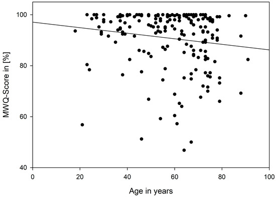 Regarding the correlation between age and MWQ in the fracture collective, the multiple regression analysis showed an increasing MWQ Score with increasing age (p = 0.041) Figure 5.
